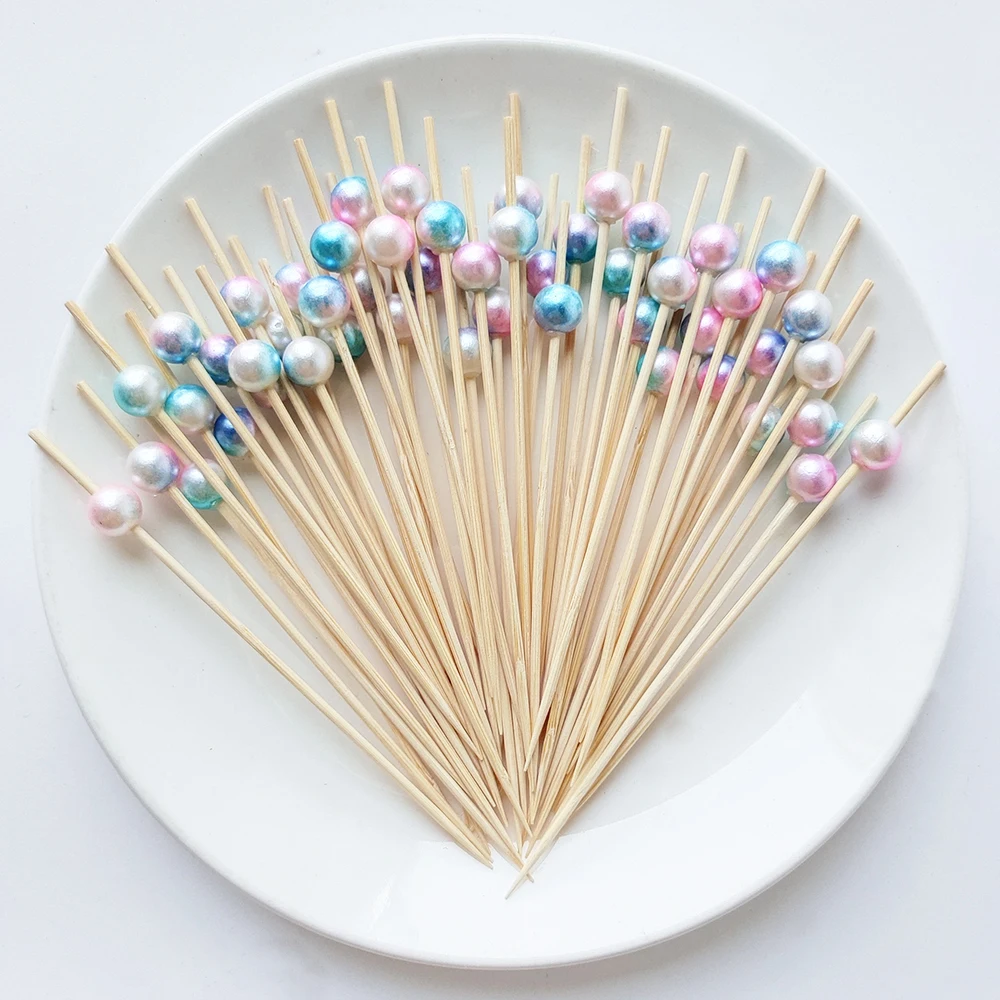 100Pcs Wedding Gradient Pearl Disposable Bamboo Skewers Wooden Cocktail Picks Decor Fruit Dessert Fork Birthday Wedding Supplies