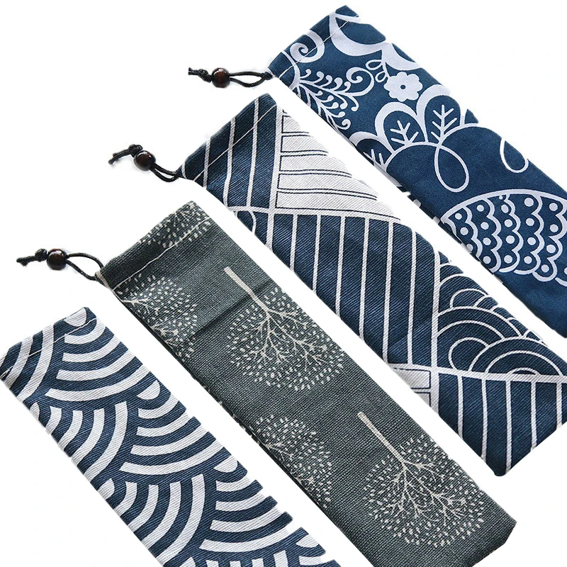 Japan Style Cutlery Bag Reusable Travel Drawstring Pouch for Kitchen Tableware Fork, Spoon, Bamboo Chopsticks, Cleaning Brush