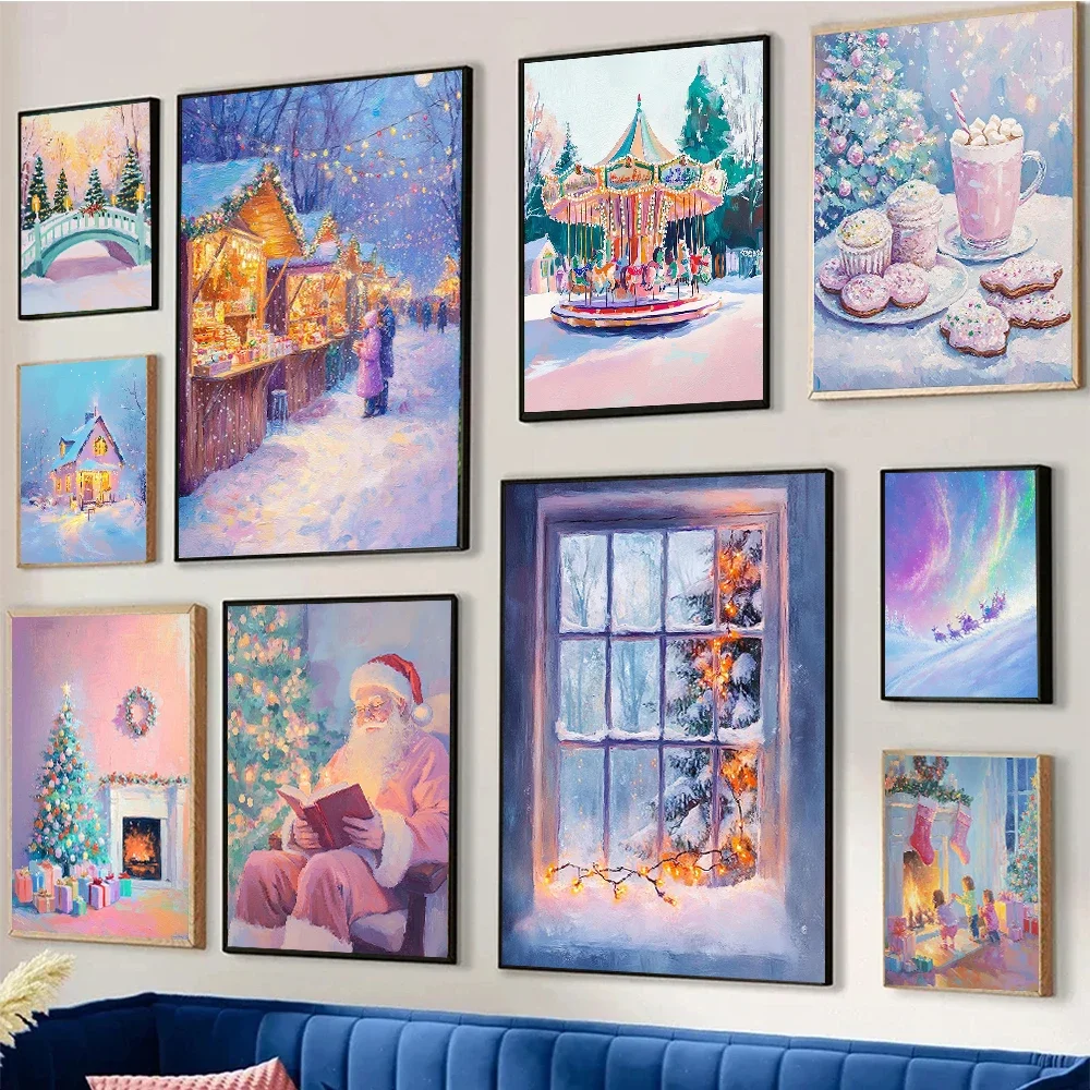 Winter Village Christmas Scene Aesthetic Art Poster Santa Claus Elk Delivering Gift Holiday Canvas Painting Christmas Home Decor