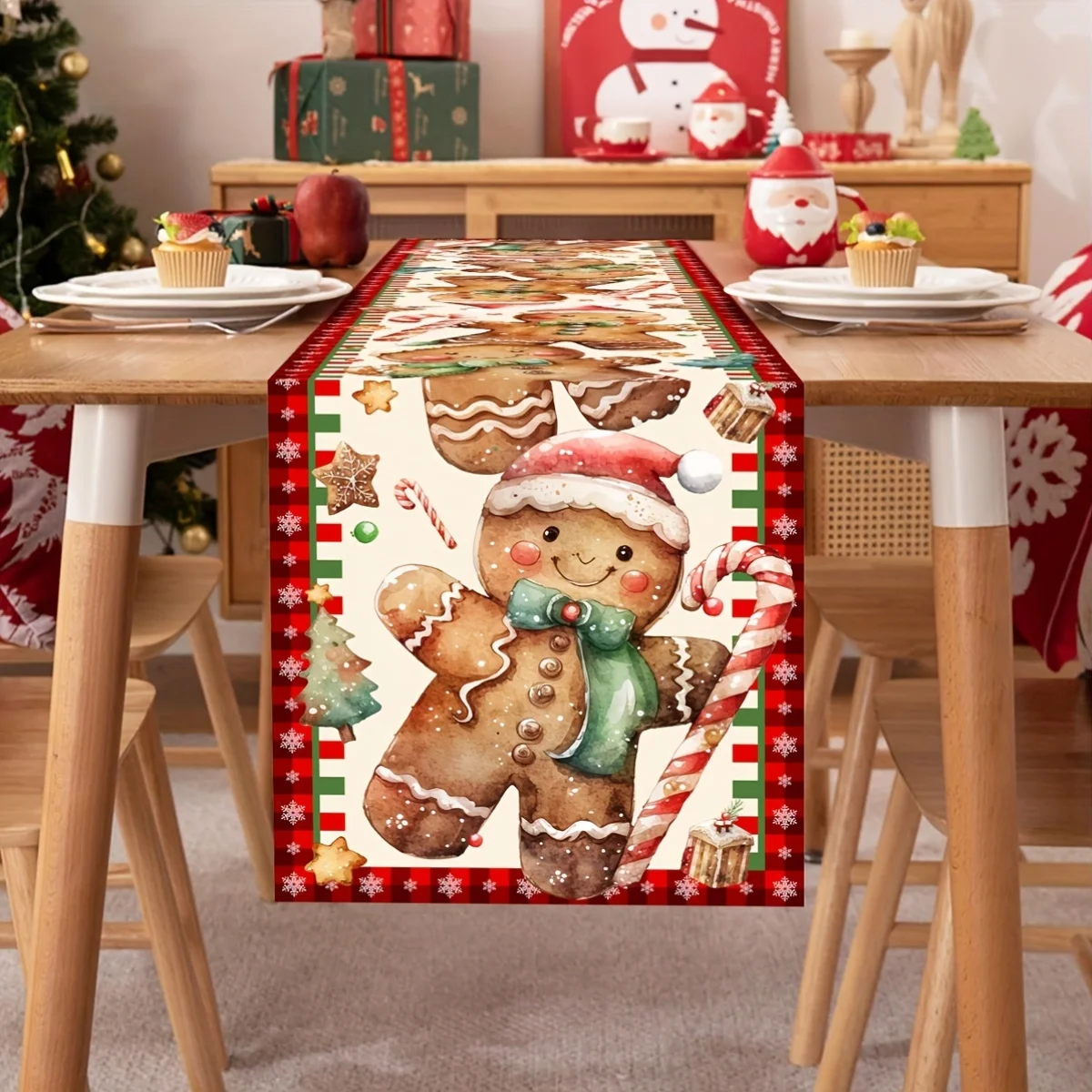 1 Piece of Christmas Gingerbread Man Table Runner, Painted with Gingerbread Men, Candy Canes and Other Christmas Elements on a Colorful Background, Suitable for Christmas Dinners, Holiday Parties,
