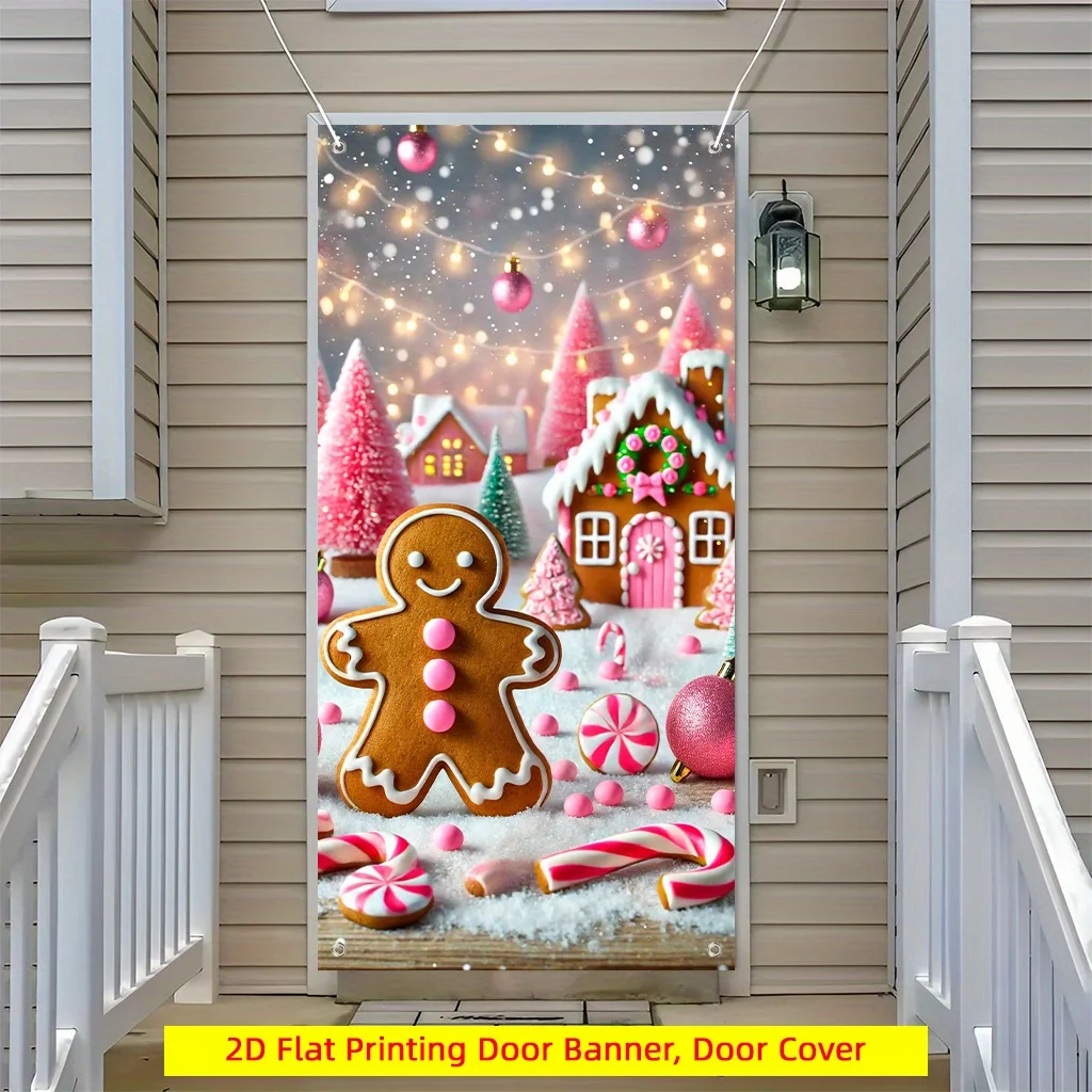 1 piece, gingerbread man door curtain - winter wonderland Christmas decoration, with gingerbread house, candy cane and snow tree