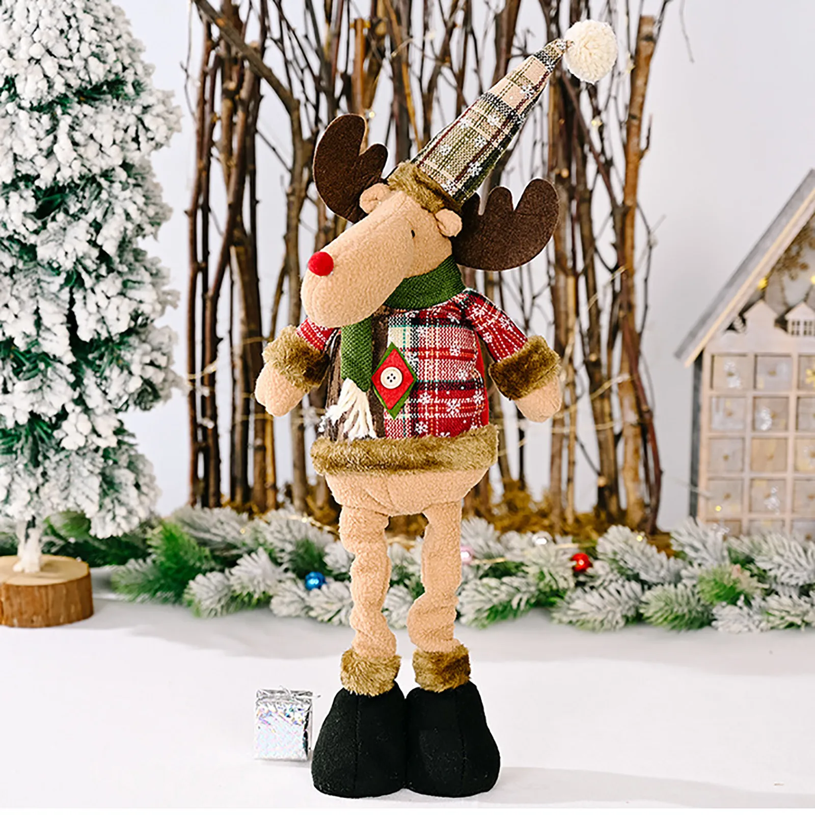Christmas Retro Snowflake Plaid Fabric Stretch Moose Doll Holiday Festive Home Decor Ornament Unique Xmas Decor Gift Ornament
