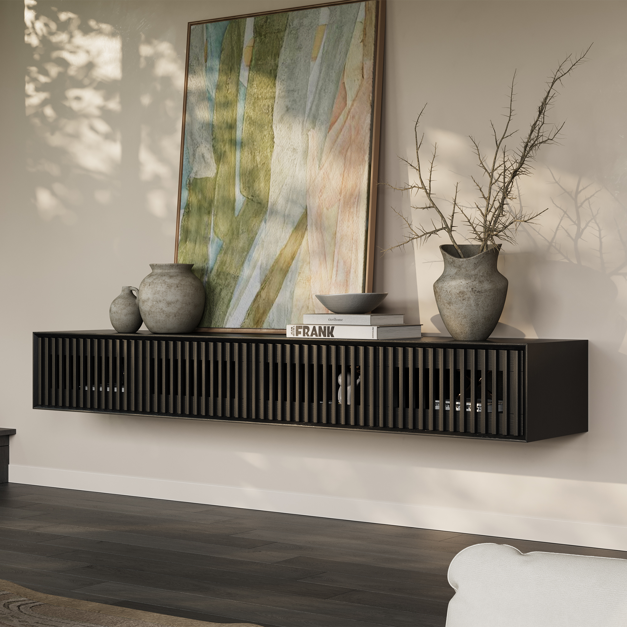 [Aesthetic Design]Mid-century modern style, characterized by simplicity and elegance, with a geometric aesthetic design. creating a sense of stability and sophistication. The design of the latticed door panels is minimalist, enhancing the interplay...  Read more