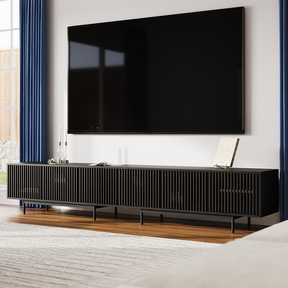 95" Modern Wood Black TV Stand, Rectangular Media Console with Storage, on the Ground TV Console, Fully-Assembled, Perfect for 85-inch TVs