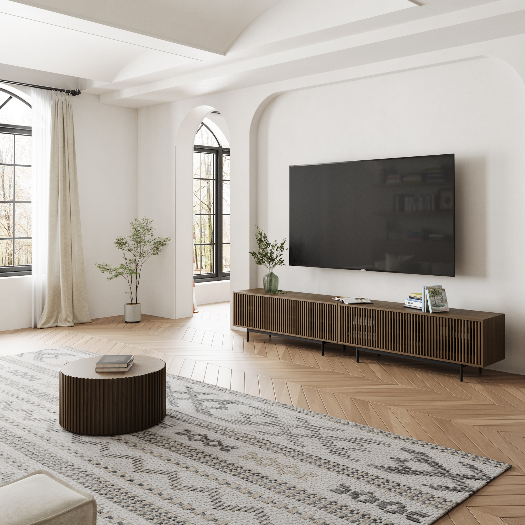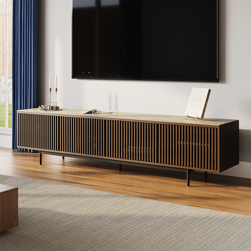 94.49"Mid-Century Modern Matte Sintered Stone Tabletop TV Stand, Slatted Door TV Console, Walnut Color Media Console