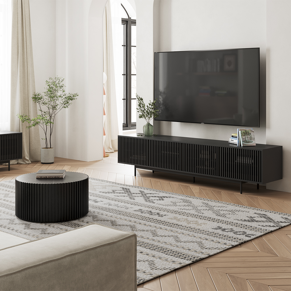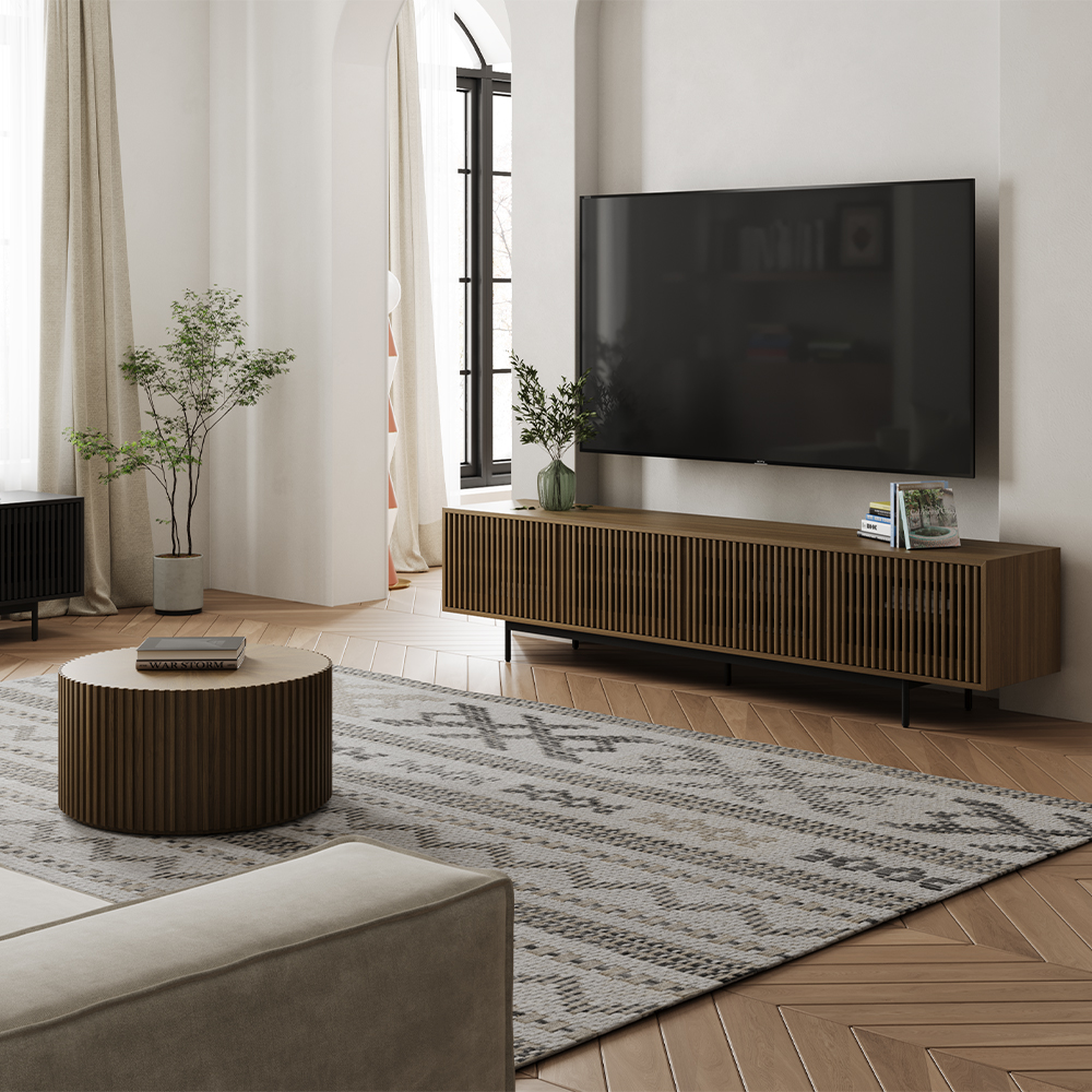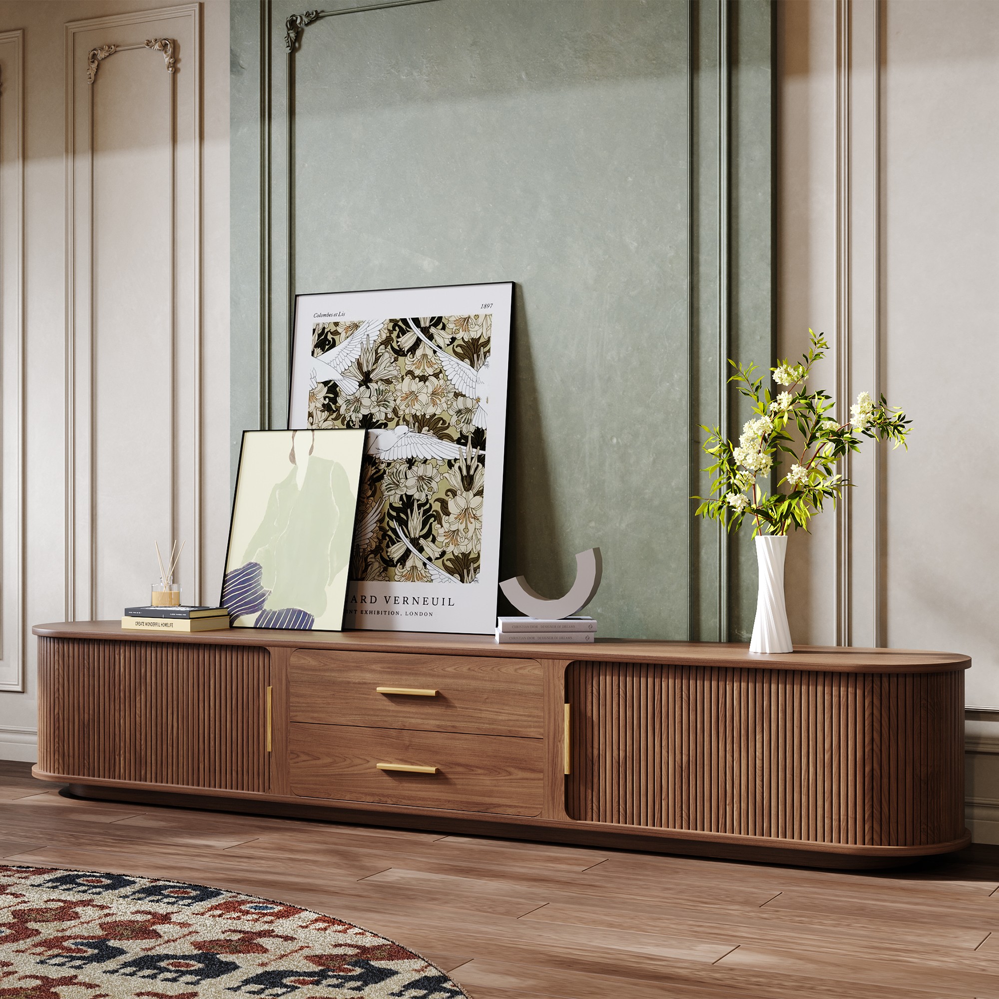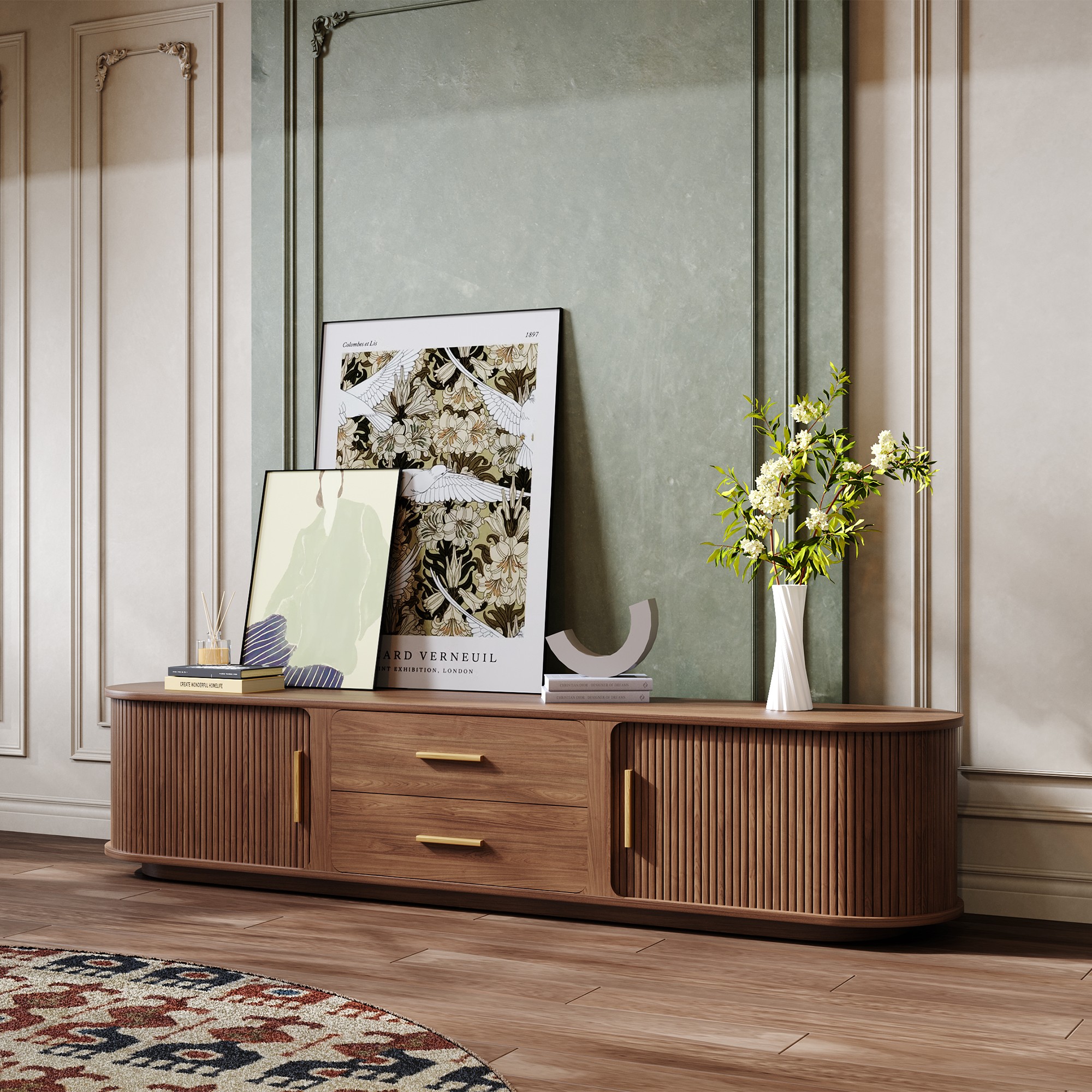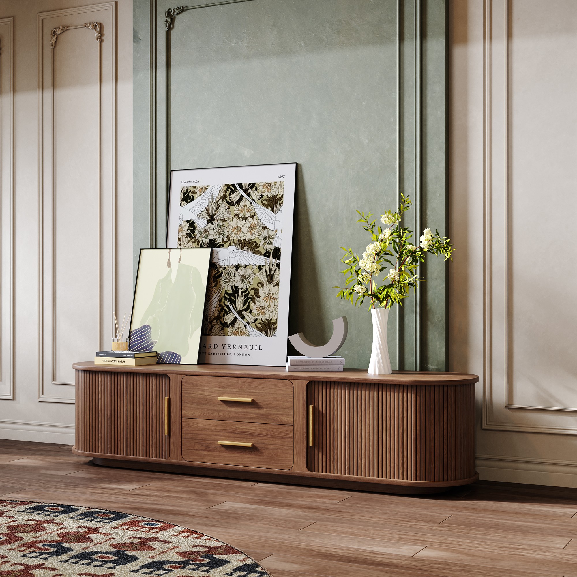 [Mid-Century Modern Design]This TV stand combines mid-century modern style with walnut slatted roll-up doors, offering a simple yet artistic lookperfect for adding elegance to your living room.[Cable Management]Features three cable holestwo on the...