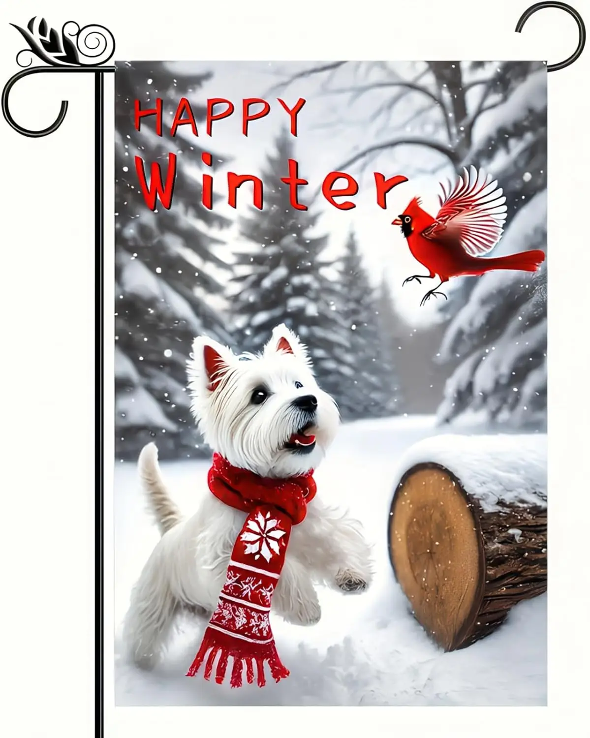 Happy Winter Cardinal Dog Westie Garden Flag 12x18 Double Sided Seasonal Outdoor Patio Lawn Yard Decoration Banner IIE