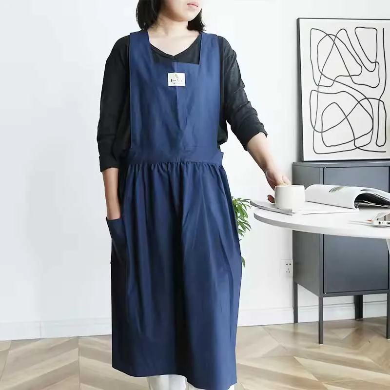 Long Large Pleated Cotton Waterproof Apron Kitchen Women's Cross-back Oilproof Stain-resistant Pinafore Smock For Cooking Baking