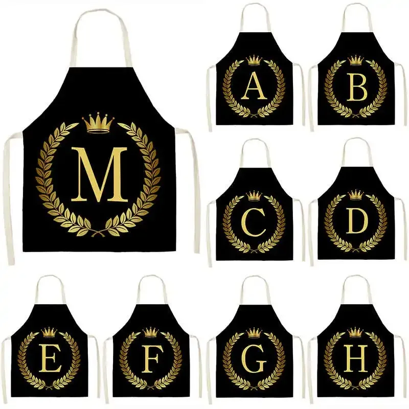 Black Gold Crown Letter Letter Print Kitchen Apron Women Mens Cotton Linen Apron Cooking Home Cleaning Bib