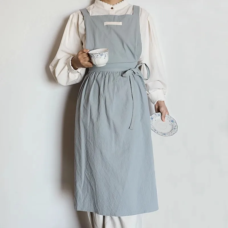 Women Japanese and Korean simple apron denim apron cotton and linen solid color blouse kitchen Florist coffee shop apron