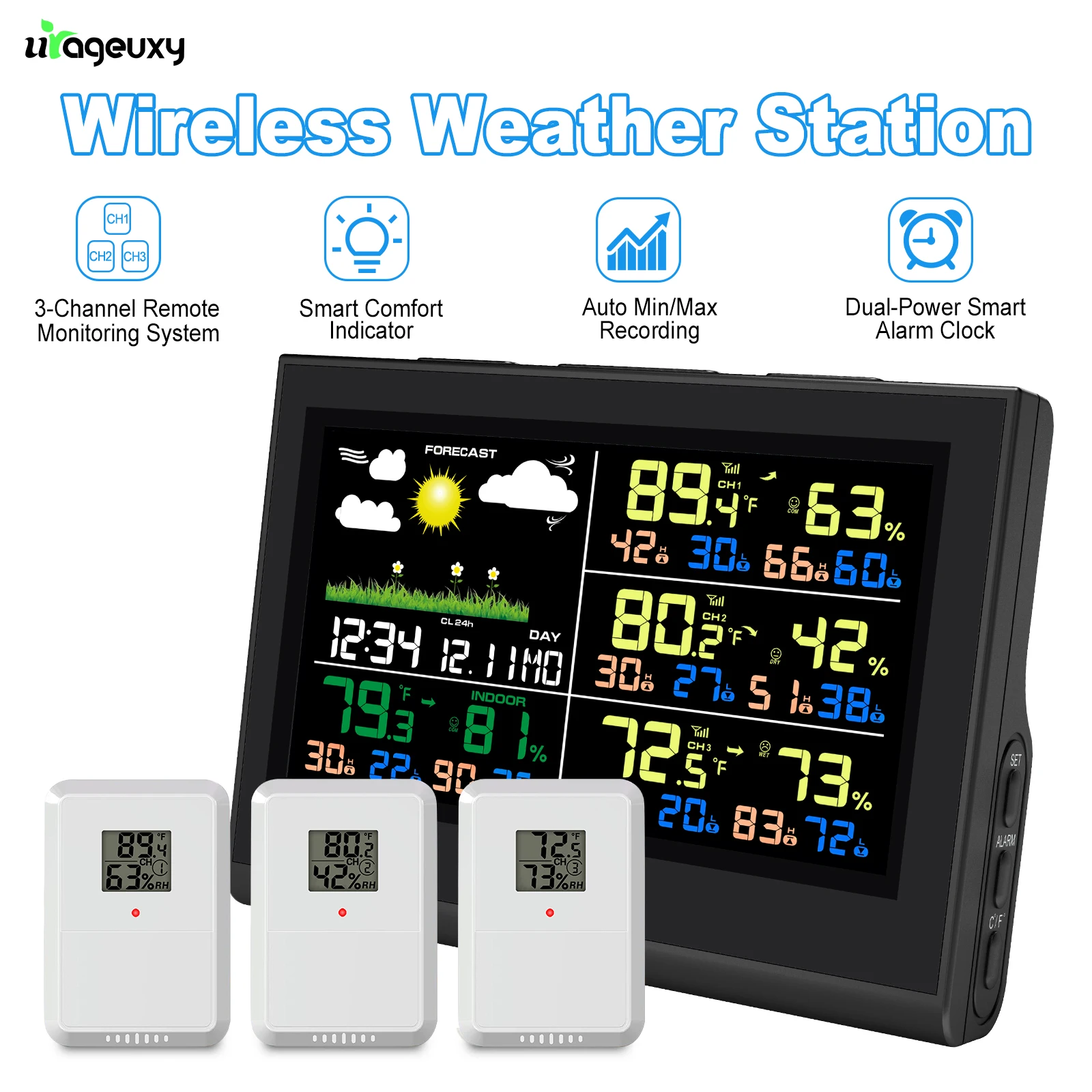 Smart Wireless Weather Station with 3 Sensors Large Color Display Indoor Outdoor Digital Thermometer Hygrometer for Home Office