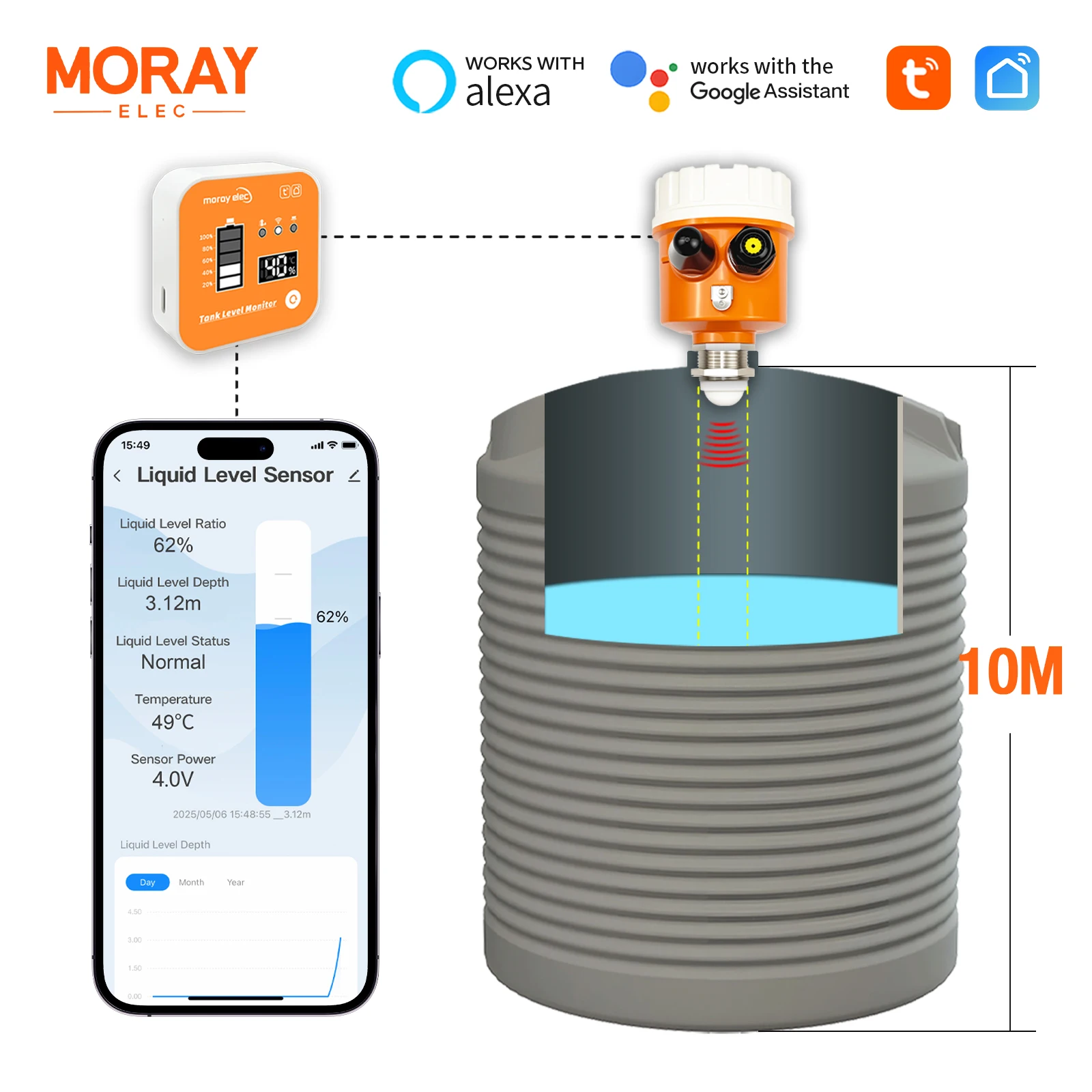 Moray ME201RSP Tuya APP Solar Power Wireless Ultrasonic Display Temperature Indicator Time Display Tank Level Monitor