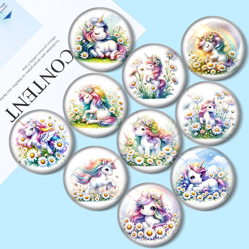 Unicorn and Daisy Flower 10pcsColoured drawing12mm/16mm/18mm/25mm Round Photo Glass Cabochon Demo Flat Back Making findings