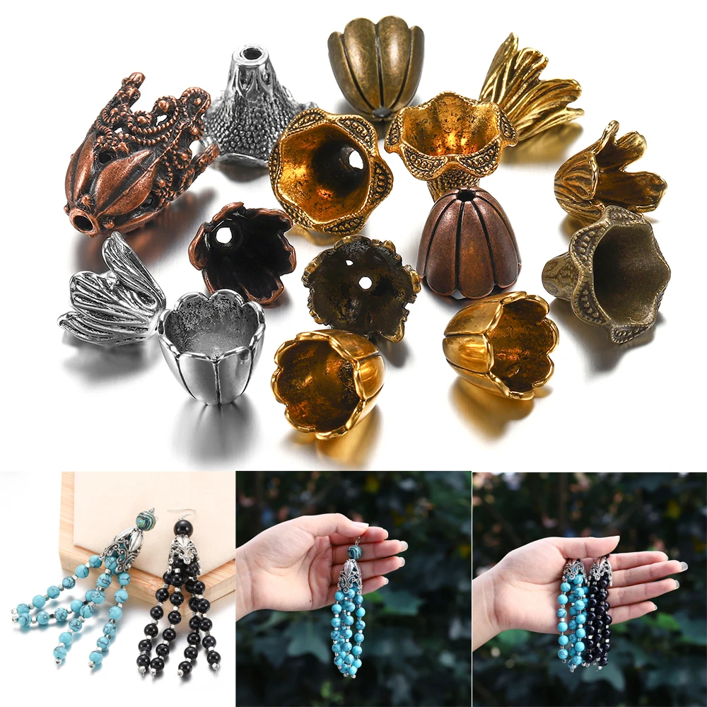 2pcs/lot Antique Bronze Hollow Flower Bead End Caps Silver Gold Spacer Apart Bead Cap For DIY Jewelry Making Finding Accessories
