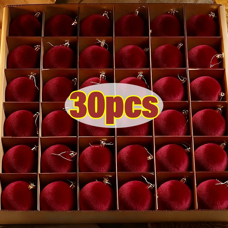 30/1Pcs Wine Red Flocked Xmas Balls Christmas Tree Ornaments Hanging Pendents Velvet Ball Festival Party Home Decor Supplies