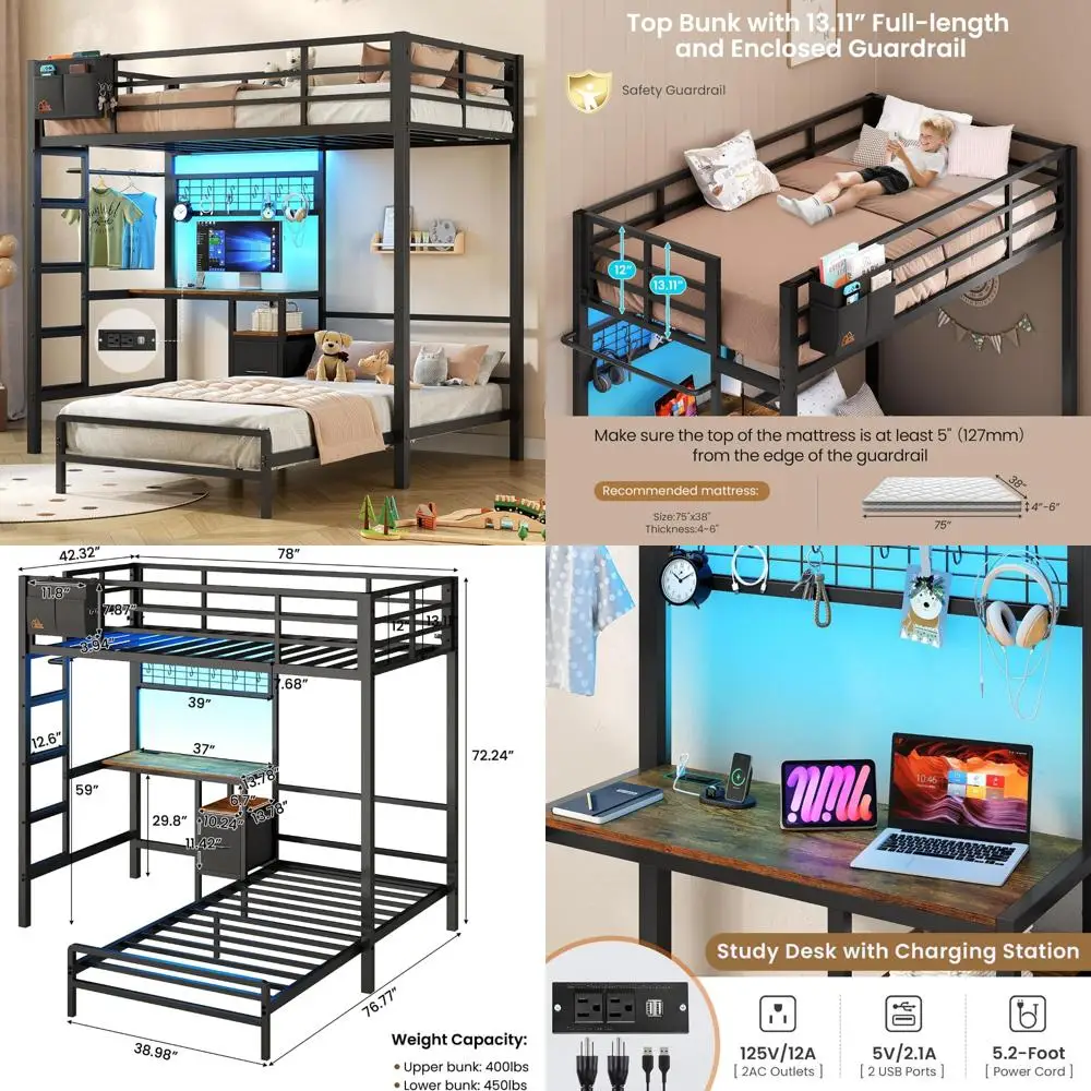 metal l-shaped twin over twin bunk bed with desk, led lights, charging station, and storage drawers