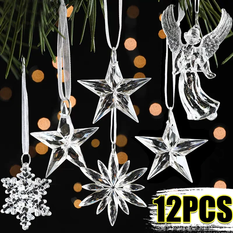 Crystal Christmas Tree Ornaments Snowflake Pentagram Angel Elk Reindeer Threaded Ice Items Shape Home Xmas Party Hanging Decor