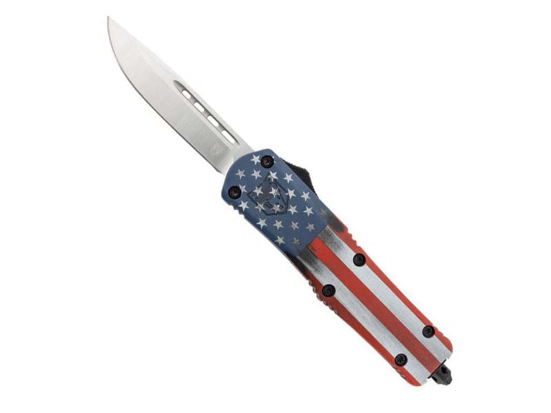 CobraTec Knives FS-3 Medium OTF Automatic Folding Knives 3in D2 Steel Drop Point Non-Serrated Blade Aluminum Cerakote/USA Flag Handle MCUSAFS-3DNS