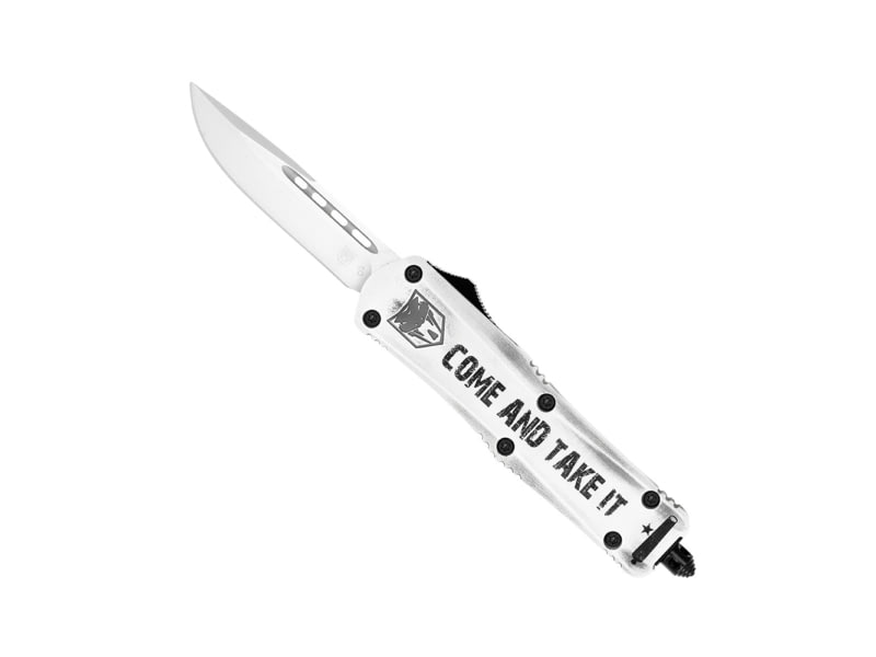 CobraTec Knives FS-3 Medium OTF Automatic Folding Knives 3in D2 Steel Blade Drop Point Non-Serrated Blade Aluminum Cerakote/Come And Take It Handle
