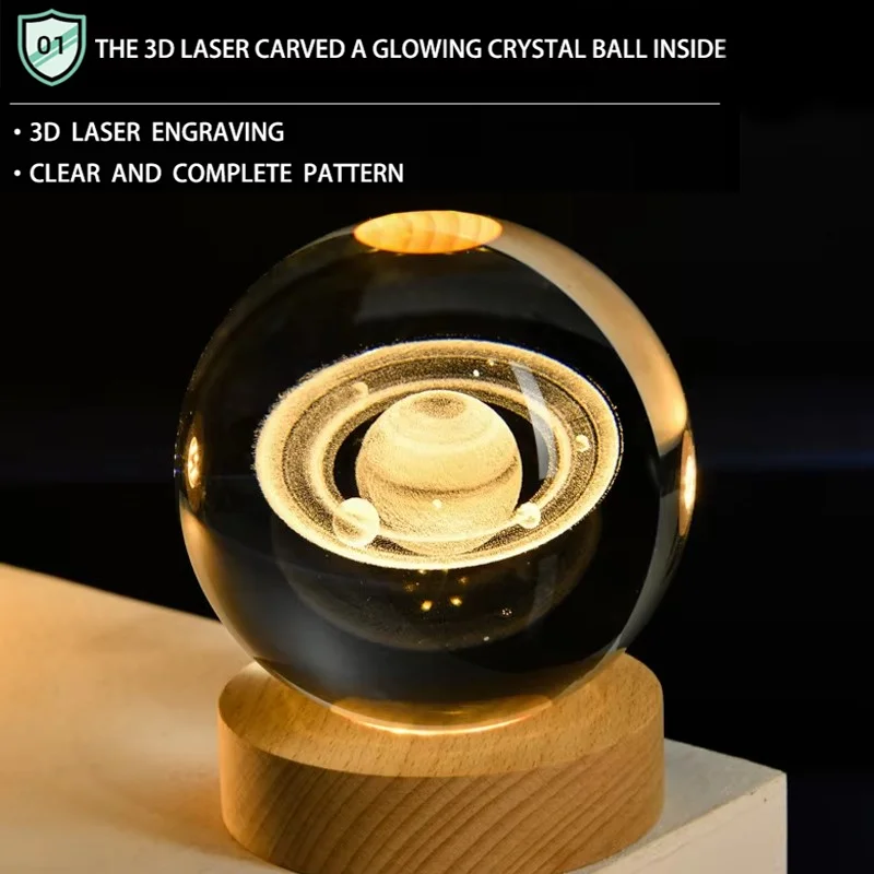 3D Saturn Crystal Ball Laser Engraved Glass Ball Globe Galaxy Astronomy with Wood Base Planets Ball for Birthday Christmas