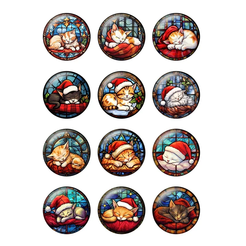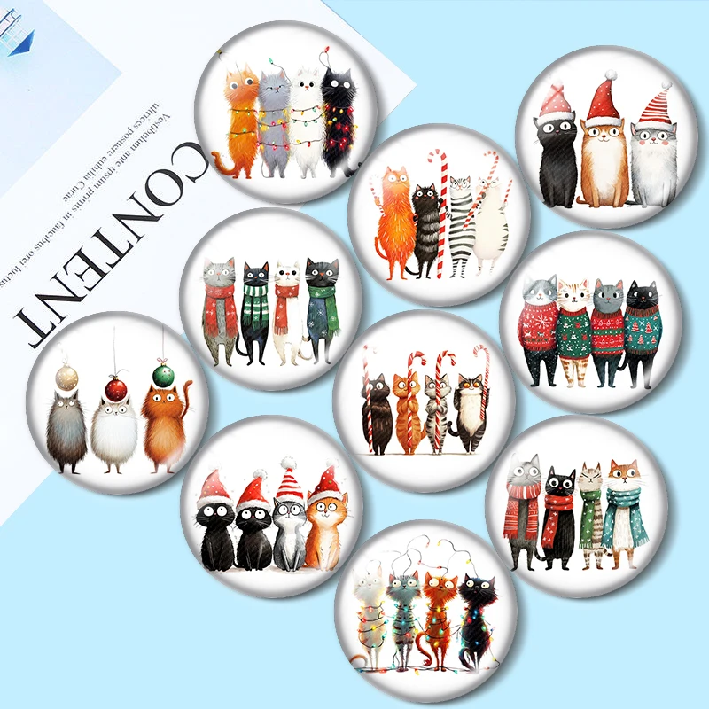 12pcs Cartoon Lovely Christmas Cat Art Pattern 10mm/12mm/20mm/25mm Round Photo Glass Cabochon Demo Flat Back Making FindingsT230