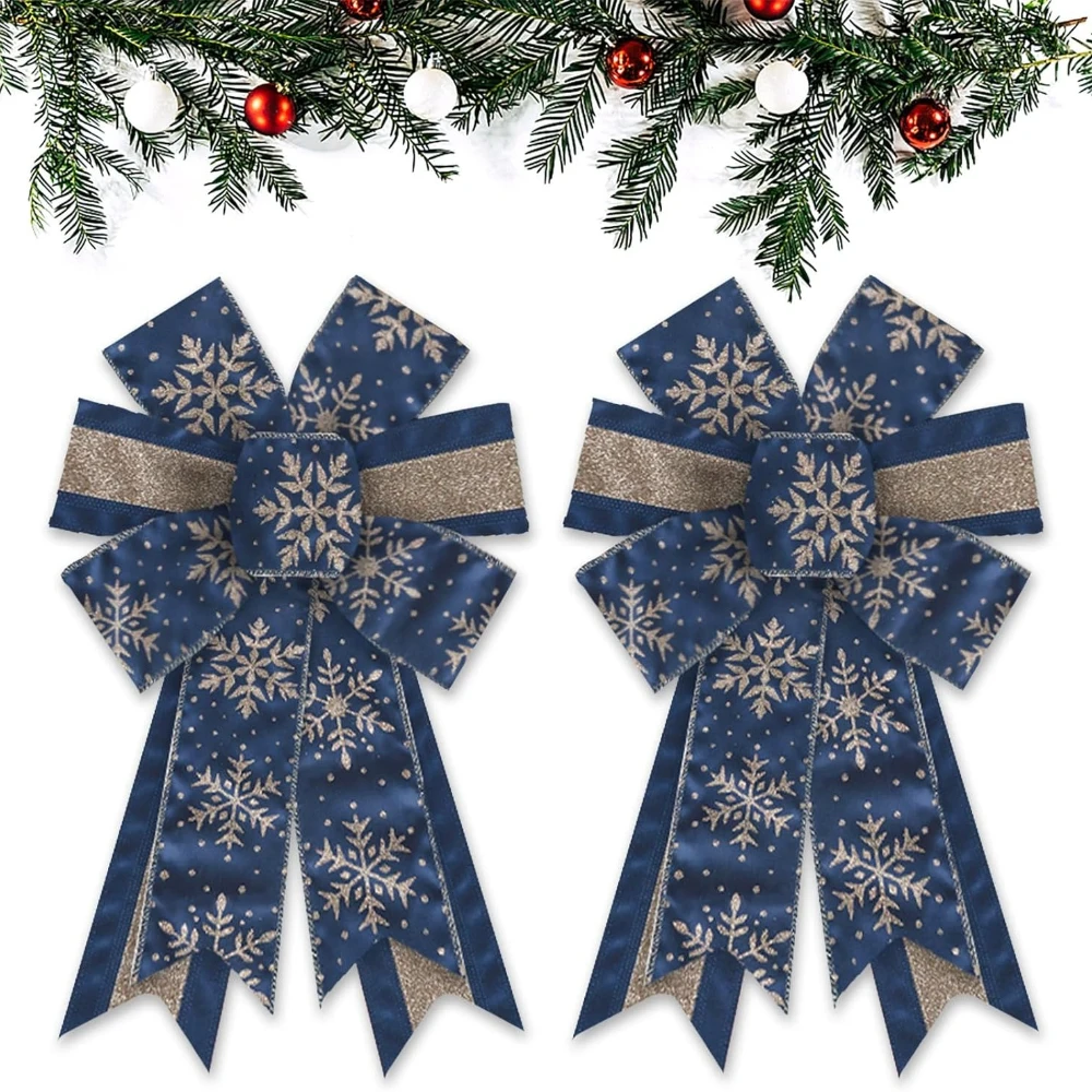 2PCS Christmas Bows Blue Gold Glitter Stripe Xmas Snowflake Bows Vintage Blue Tree Topper Bows for Christmas Home Decoration