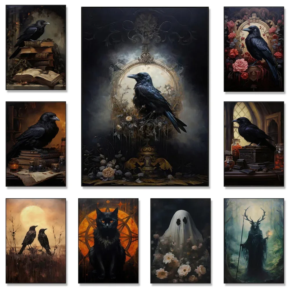 Victorian Gothic Fine Art Prints Black Cat Raven Canvas Posters Vintage Occult Dark Witchcraft Crow Decor Wall Painting For Room