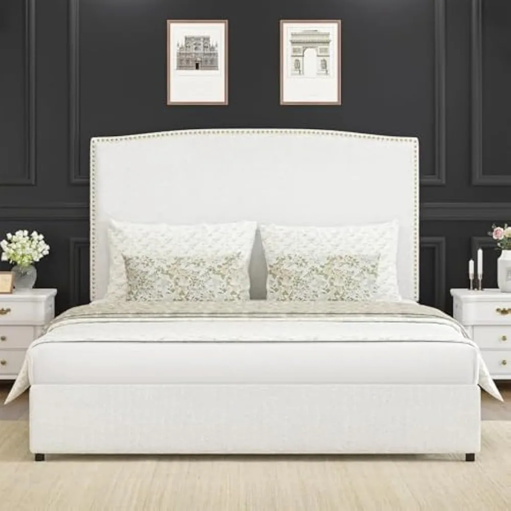 iPormis Full Bed Frame with 2 Storage Drawers, Linen Upholstered Headboard Platform Bed with Charging Station, No Box Spring Nee