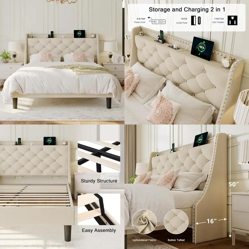 Full Size Bed Frame with Wingback Button Tufted Storage Headboard and Type AC Ports, Upholstered Platform Bed, Wooden Slats Supp