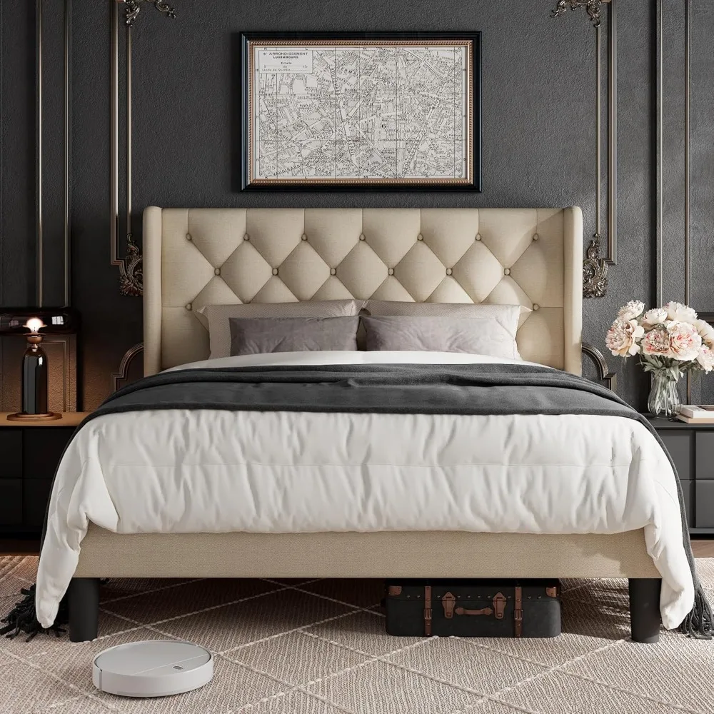 Queen Size Upholstered Platform Bed Frame with Tall Wingback Tufted Headboard and Footboard