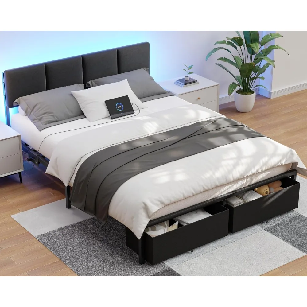 Queen Bed Frame with Headboard and Storage Drawer, Platform Bed Frame Queen Size, Upholstered Bedframe with Charging