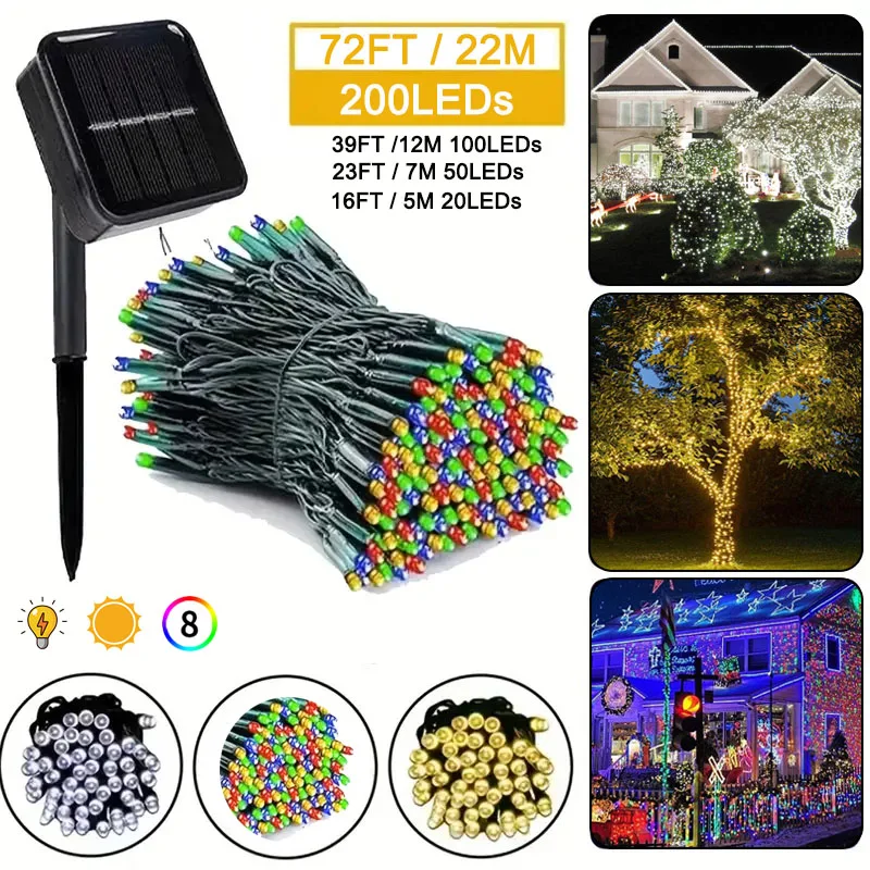 12M 8 Modes Solar String LED Fairy Lights Garland Festoon Outdoor Sunlight Powered Waterproof Lamps Christmas Garden Party Decor