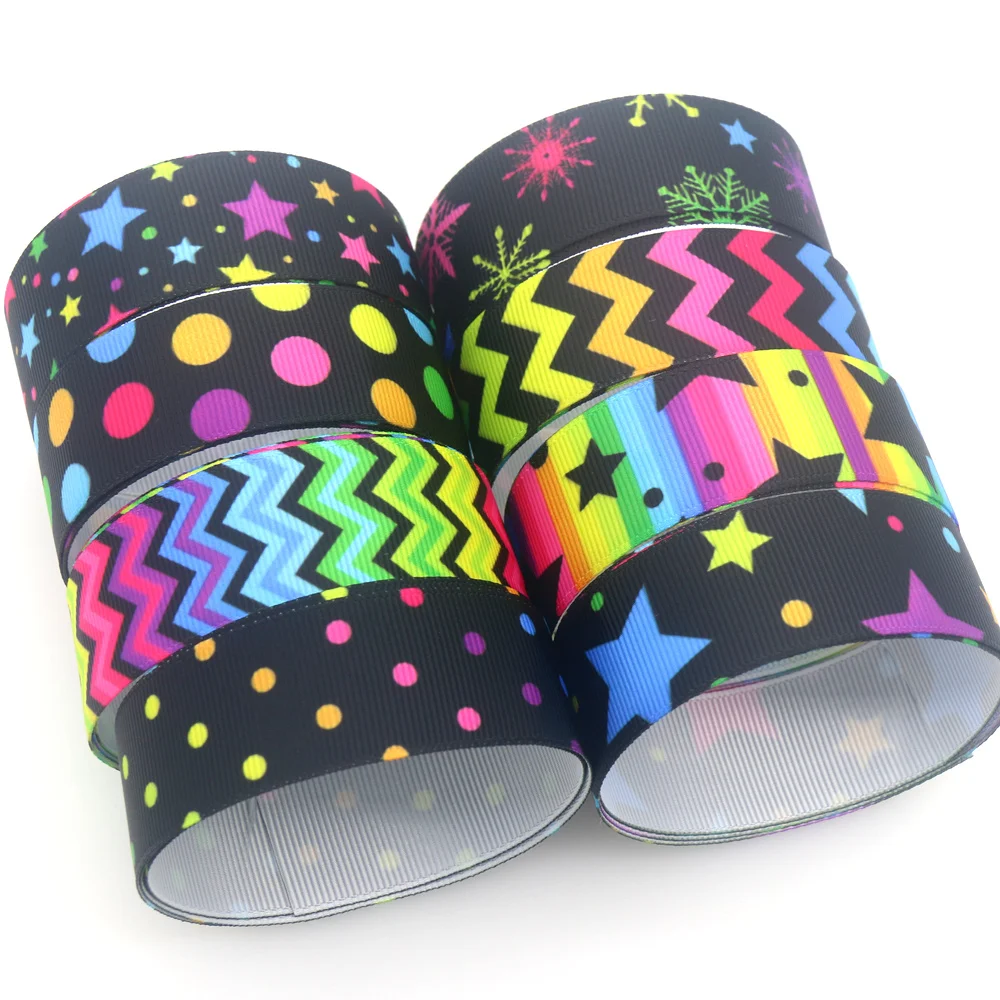 DHK 7/8'' 5yards Neon Star Stripe Polka Dot Christmas Printed Grosgrain Ribbon Accessories Material DIY Sewing Craft C2050