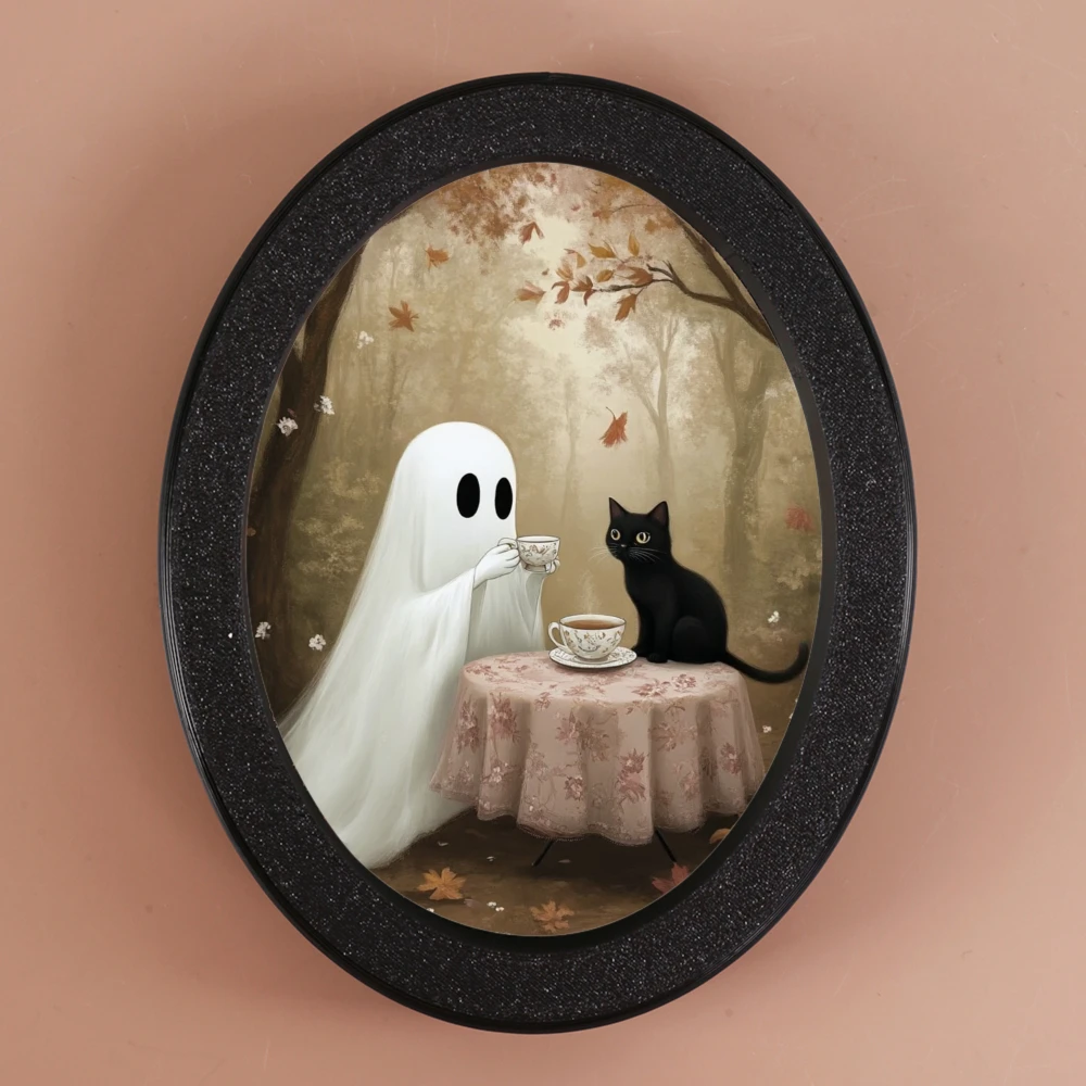 Cross-border Halloween Oval Decorative Ornament, Ghost & Black Cat Afternoon Tea in Forest Scene, Creating Warm & Healing Atmosp