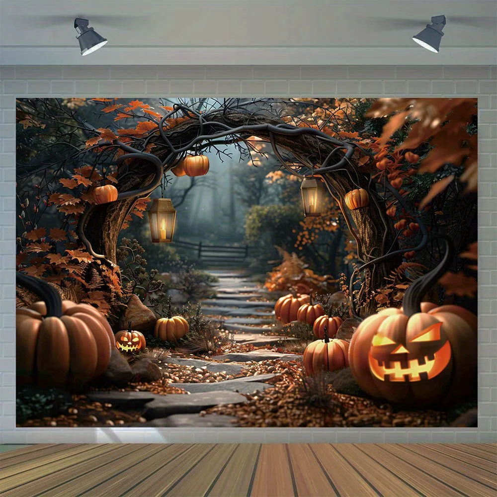 One photo, Halloween photography background, autumn maple forest horror pumpkin pattern, eerie banner decoration