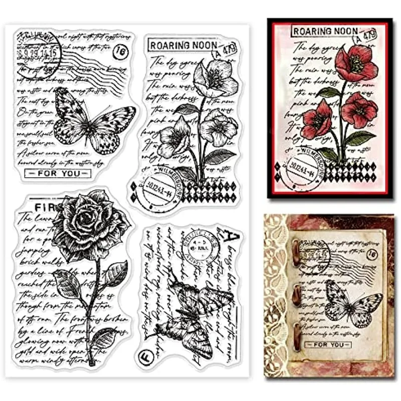 Vintage Floral Clear Stamp Art Words Transparent Silicone Stamp Butterfly Rose Rubber Stamp for Scrapbook Journal Card Making