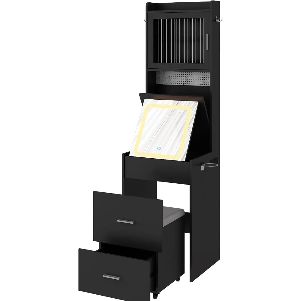 Small black dressing table set, flip dressing table LED mirror and charging station, small space mini corner bedroom storage