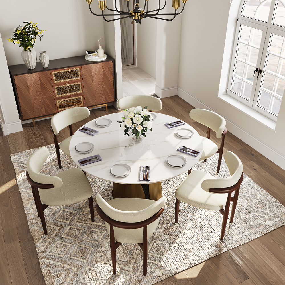 59" Modern Luxury White Round Dining Table for 6, Glossy Sintered Stone Tabletop, Bronze Carbon Steel Base