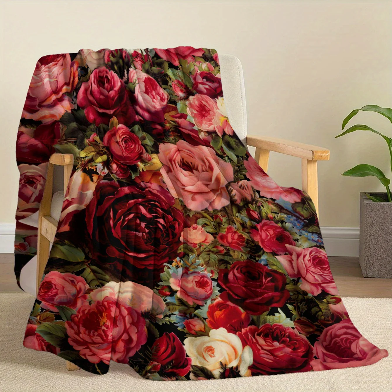 1 floral print blanket, vintage oil painting style, red rose garden, soft and warm polyester flannel, modern home decor for all