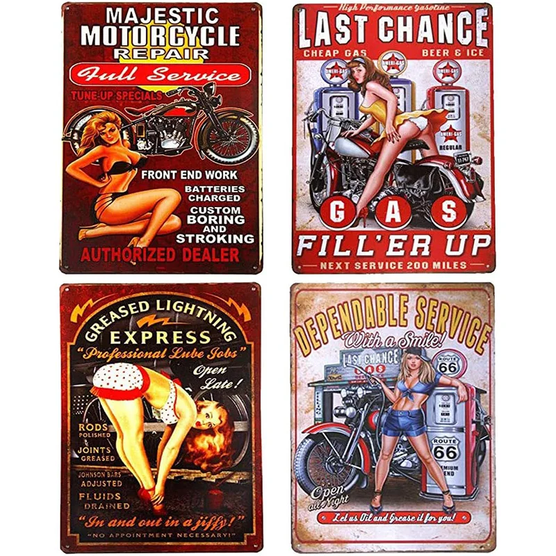 4pcs/set Pin-up Girl Gas Station Metal Tin Sign, Route 66 Metal Poster, Vintage Tin Sign for Garage Pub Bar Home, 8x12 Inches