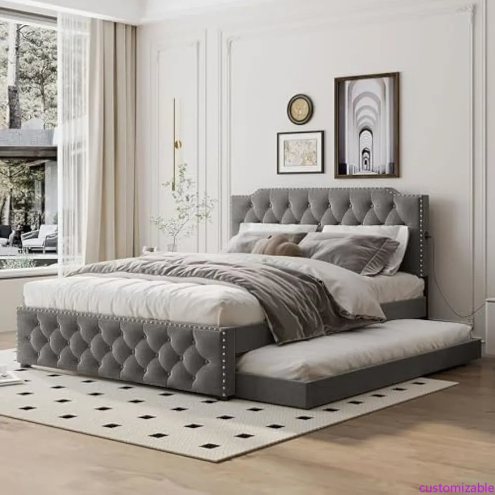 Queen Size Modern Linen Upholstered Platform Bed with Trundle and 2 USB Ports, Wingback Bed Frame without Need for Box Spring