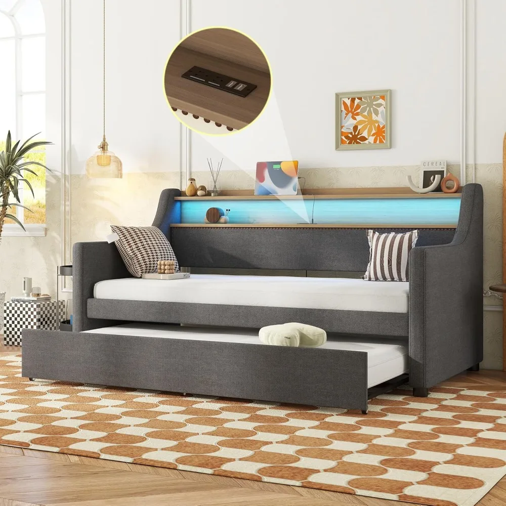 Twin Size Daybed with Upholstered Trundle, Daybeds with Built-In Charging and LED Lighting, Sofa Bed with Slat Support
