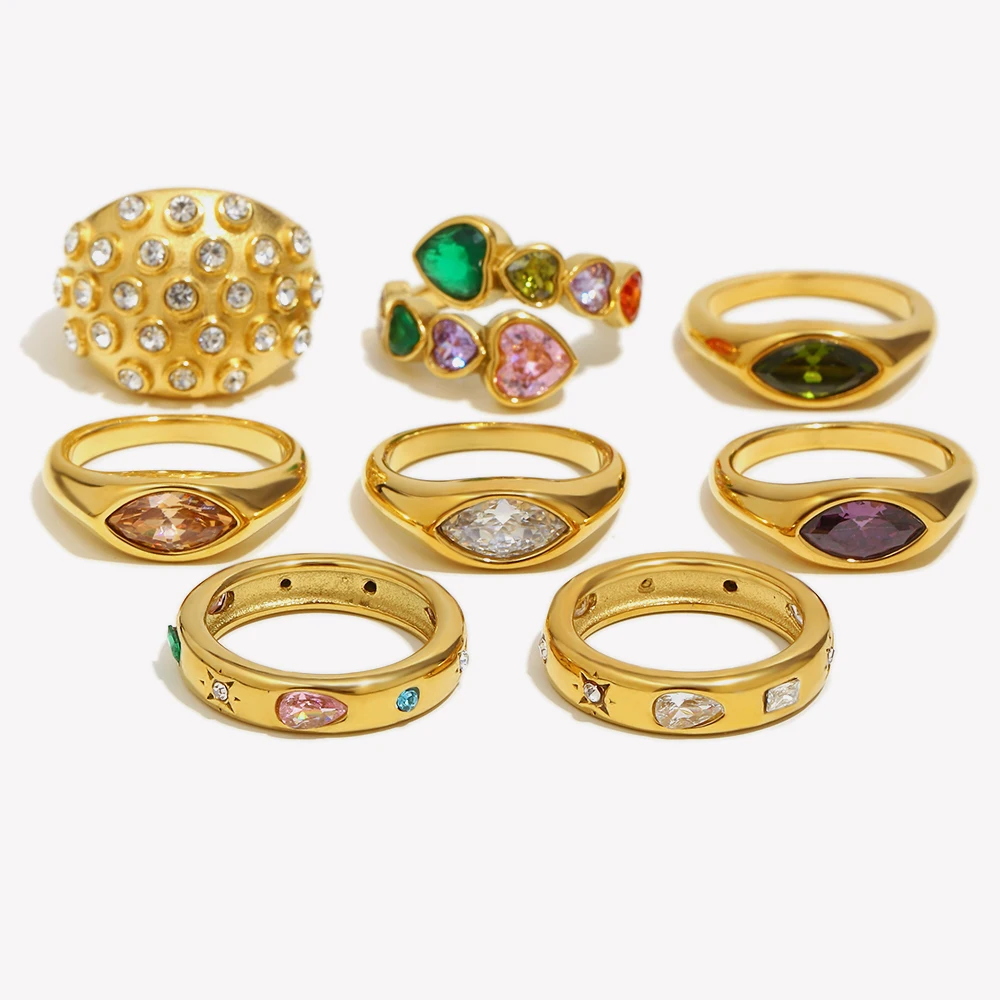 E.B.belle Rectangular Water Droplet Geometric Zircon Bubble Round Top Horse Eye Seal Heart White Colorful Stainless Steel Ring