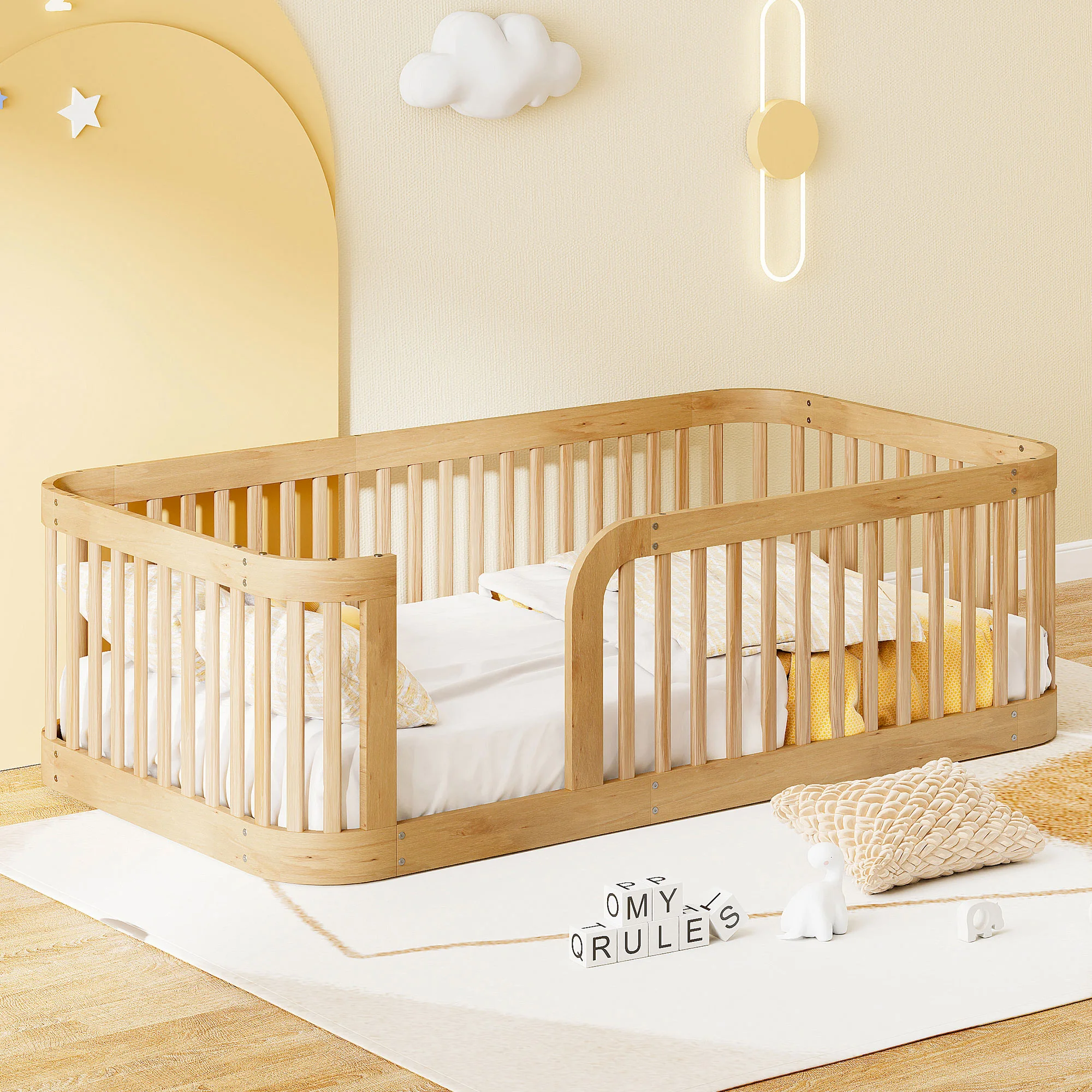 Wood Floor Twin Bed Frame toddler Beds with Fence 76.9''L x 41.1''W x 23.8''H