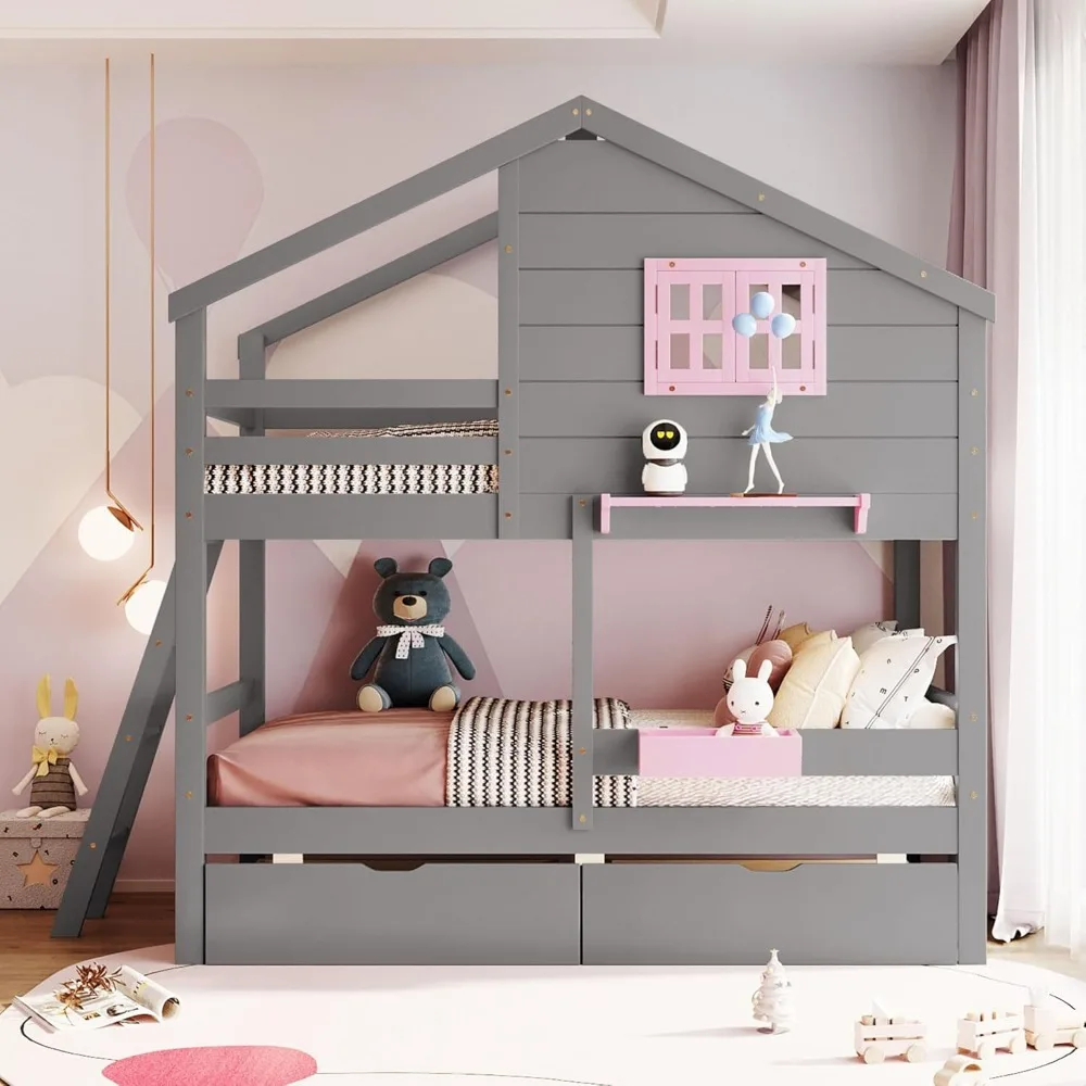 Twin Over Twin Bunk Bed with 2 Drawers, 1 Storage Box, 1 Shelf, Window and Roof, Wood Playhouse Bed Frame for Kids Boys Girls Te