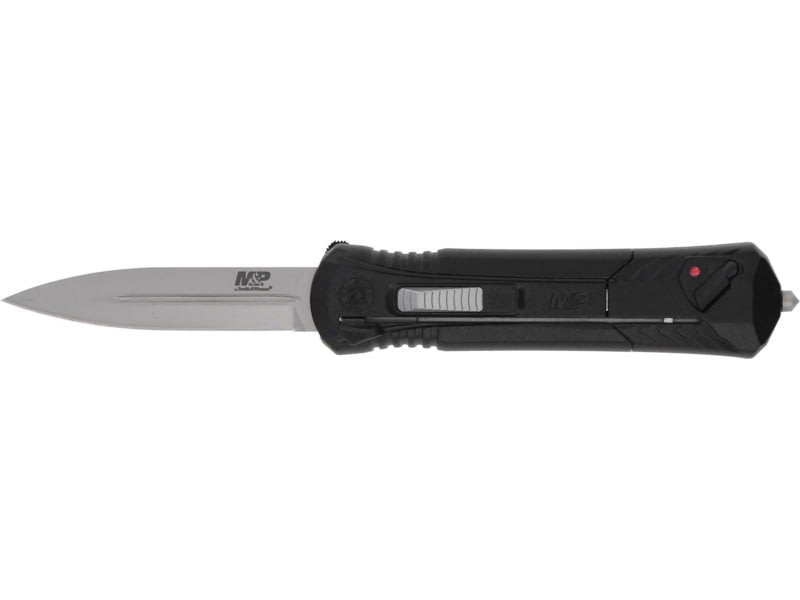 M&P MP OTF Automatic Folding Knife 3.5in Stainless Steel Spear Point Blade Plain Edge Aluminum Black Handle 1181878. The dual-edge spear tip blade is made of AUS-8 steel. This knife also features a glass breaker for emergency situations....  Read more