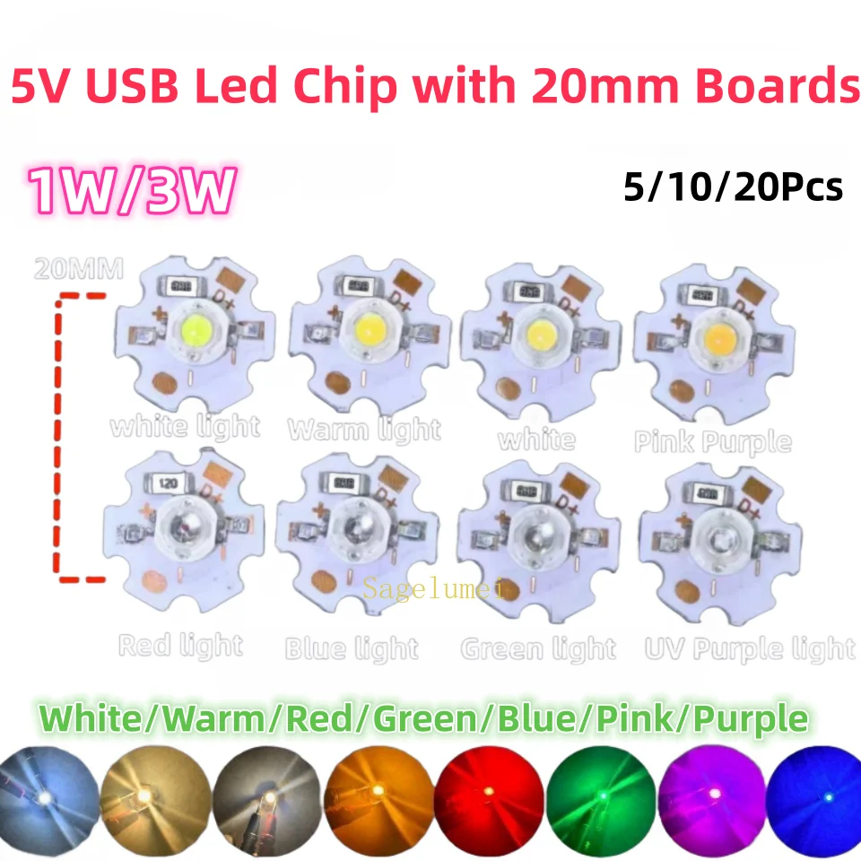 5/10/20Pcs 1W 3W 5V Led Light Beads with 20mm Lamp Board 5V USB LED Light Source Board 3W White Warm /Red/Green/Blue/Purple/Pink