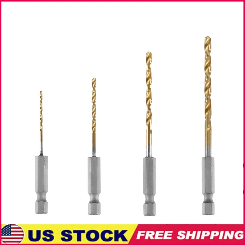 4-Piece Titanium Drill Bit Set 135° Split Point Hex Shank Wood Metal PVC 1/16 3/32 1/8 5/32 Quick Change