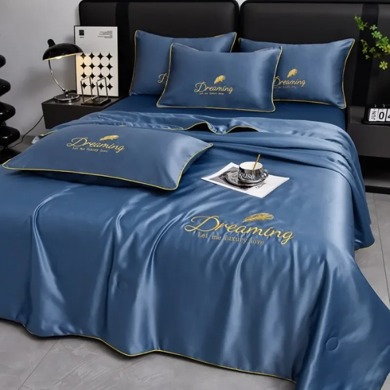 100% Washed Silk Summer Quilt Embroidery Smooth Ice Cooling Comforter for Bed Silky Solid Blanket Soft Cool Summer Blanket