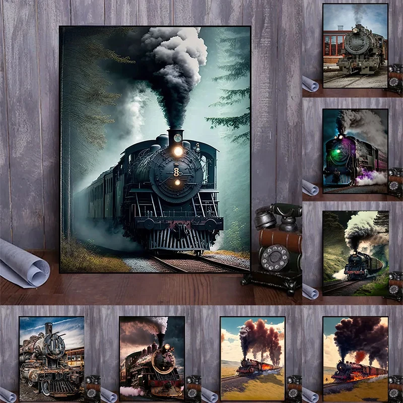 Vintage Railroad Retro Railway Steam Train Locomotive Landscape Art Poster Canvas Painting Wall Prints Picture Room Home Decor
